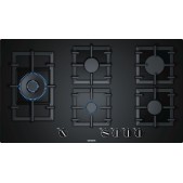 Gaskookplaat. Kookzone's: 5. Breed: 90 cm. Bediening: knopbediening. Kleur: Zwart. Pannendragers: Gietijzer. StepFlame Technology. Wokbrander.