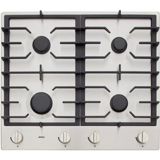 Gaskookplaat. Kookzone's: 4. Breed: 60 cm. Bediening: Knoppen. Kleur: RVS. Pannendragers: Gietijzer. Thermische beveiliging.